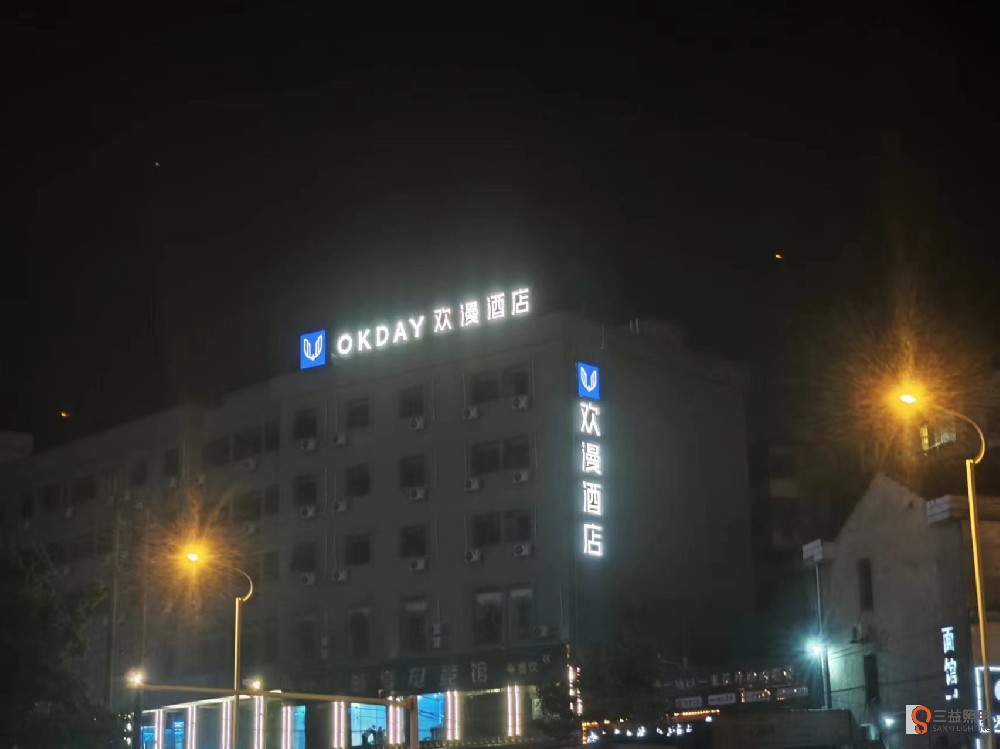 益陽(yáng)市歡漫酒店外墻發(fā)光字采用不銹鋼制作面殼和底亮,亞克力面板,內(nèi)置藍(lán)景光源,熱鍍鋅方通鋼架。